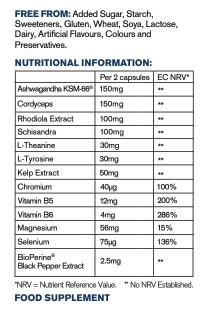 Ingredients: Ashwagandha KSM-66® (Withania somnifera), Cordyceps (Cordyceps Sinensis), Schisandra Berry (Schisandra chinensis), Rhodiola (Rhodiola rosea) Extract, L-Tyrosine, L-Theanine, Magnesium Citrate, Selenium (L-Selenomethionine), Vitamin B5 (Pantothenic Acid, Calcium Salt), Kelp (Fucus vesiculosis) Extract, Vitamin B6 (Pyridoxine Hydrochloride), Bioperine® Black Pepper (Piper Nigrum) Extract, Chromium Picolinate