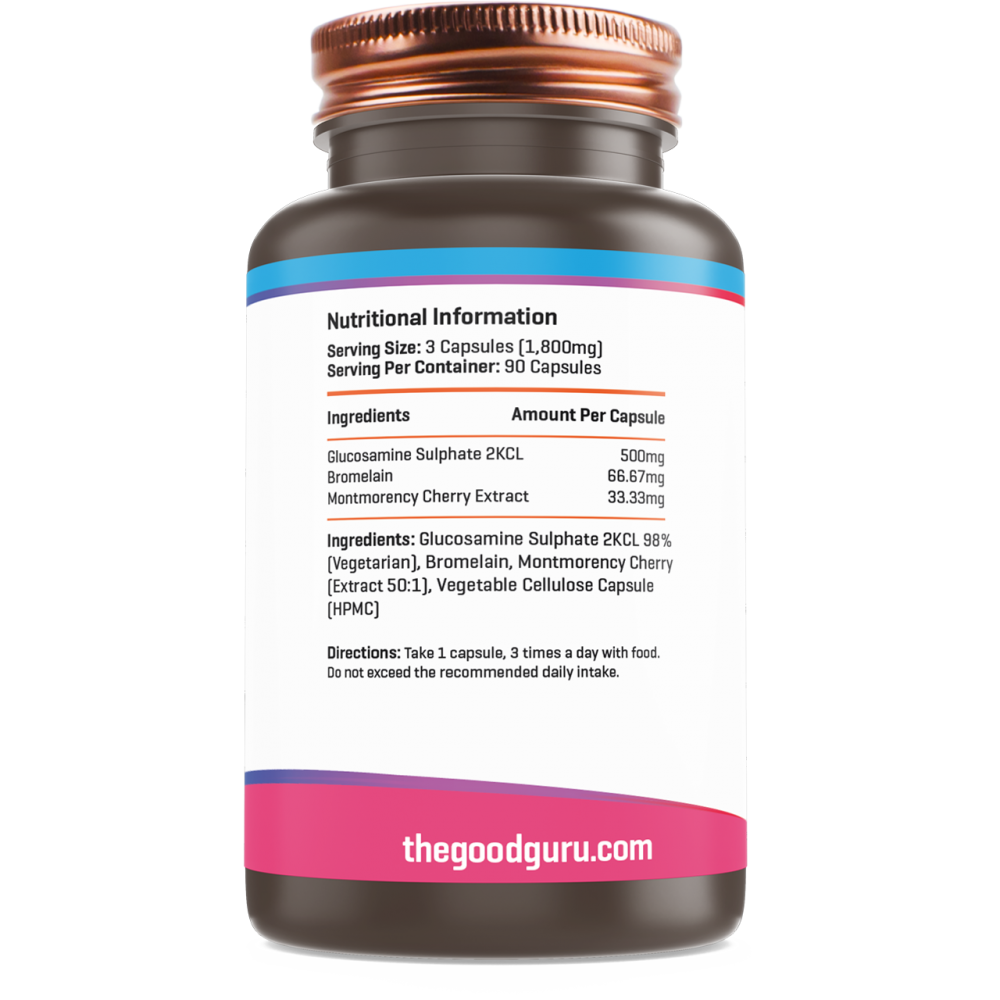 Ingredients: Glucosamine Sulphate 2KCL, Bromelain, Montmorency Cherry (Extract 50:1), vegetable cellulose capsule (HPMC)