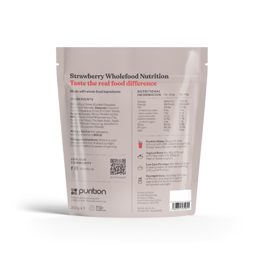 Directions: A 40g serving of Purition can be enjoyed once or twice daily. Put 200-250ml of your favourite milk into a blender. Add 40-50g of Purition, and anything else you might like! Blend and enjoy as a healthy shake. Or simply stir in to natural or greek yogurt.